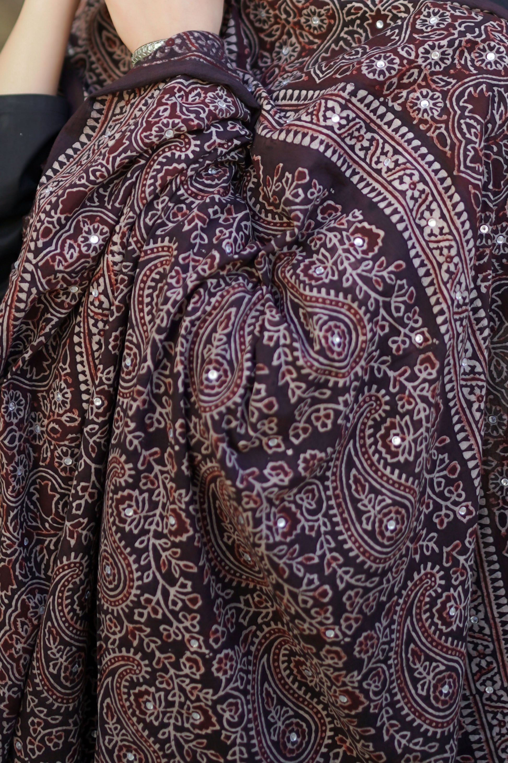 Made using natural, eco-friendly dyes on premium quality fabric, each piece reflects the dedication and craftsmanship of skilled artisans. The rich Black & Reddish tones create a striking contrast, making it a perfect statement piece for both everyday wear and special occasions.